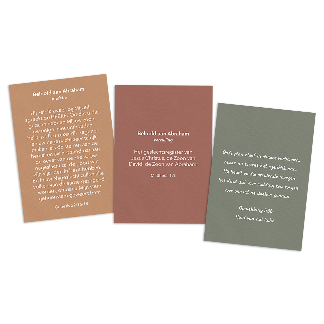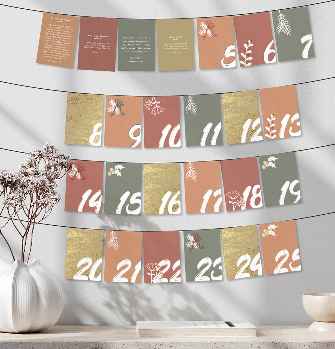 • 25 kaartjes met het nummer van de dag en op de andere zijde een bijbeltekst (profetie of vervulling), lied of quote