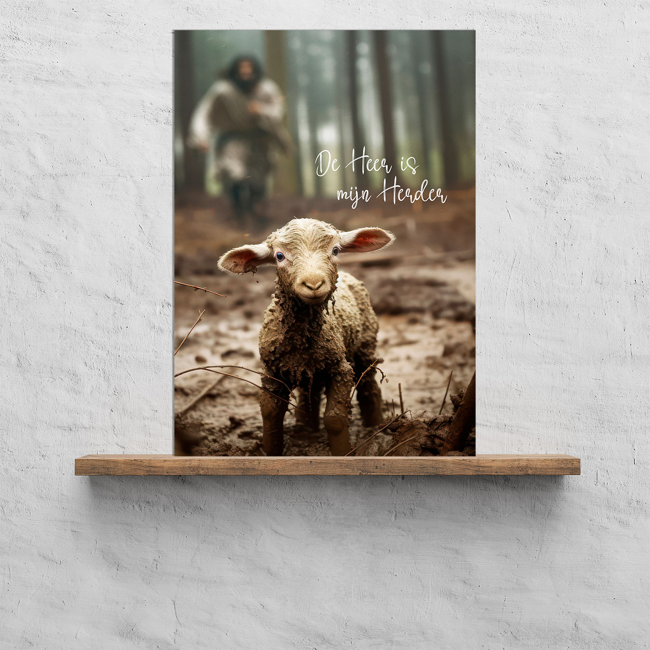 Plaat van plexiglas met de afbeelding van een lam met op de achtergrond een herder. Met de tekst: ‘De Heer is mijn Herder‘.