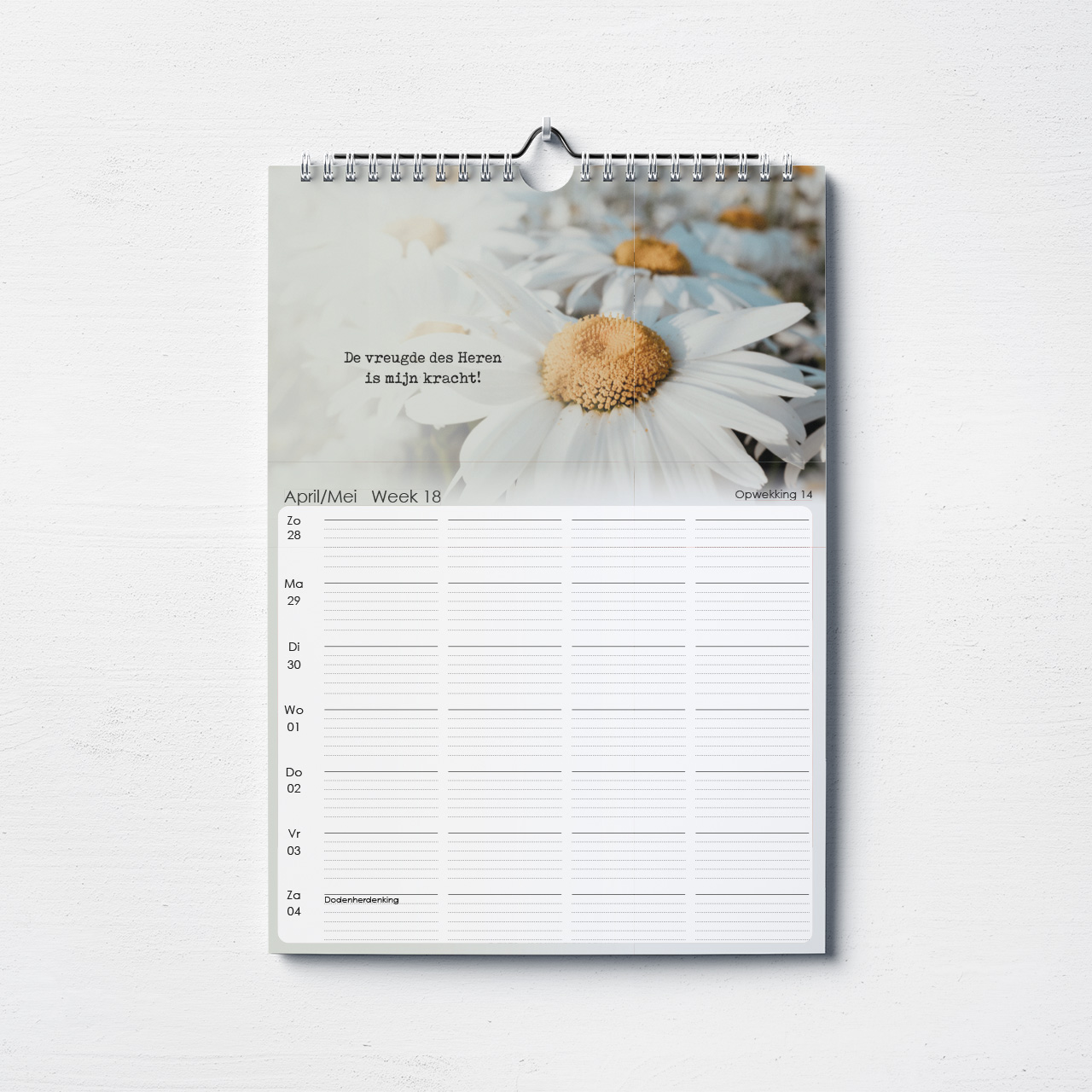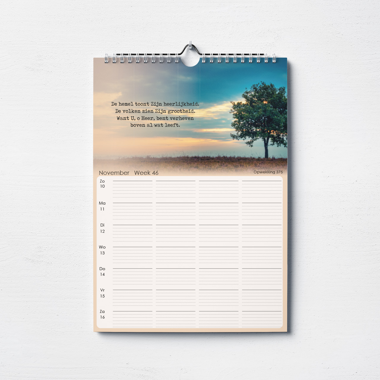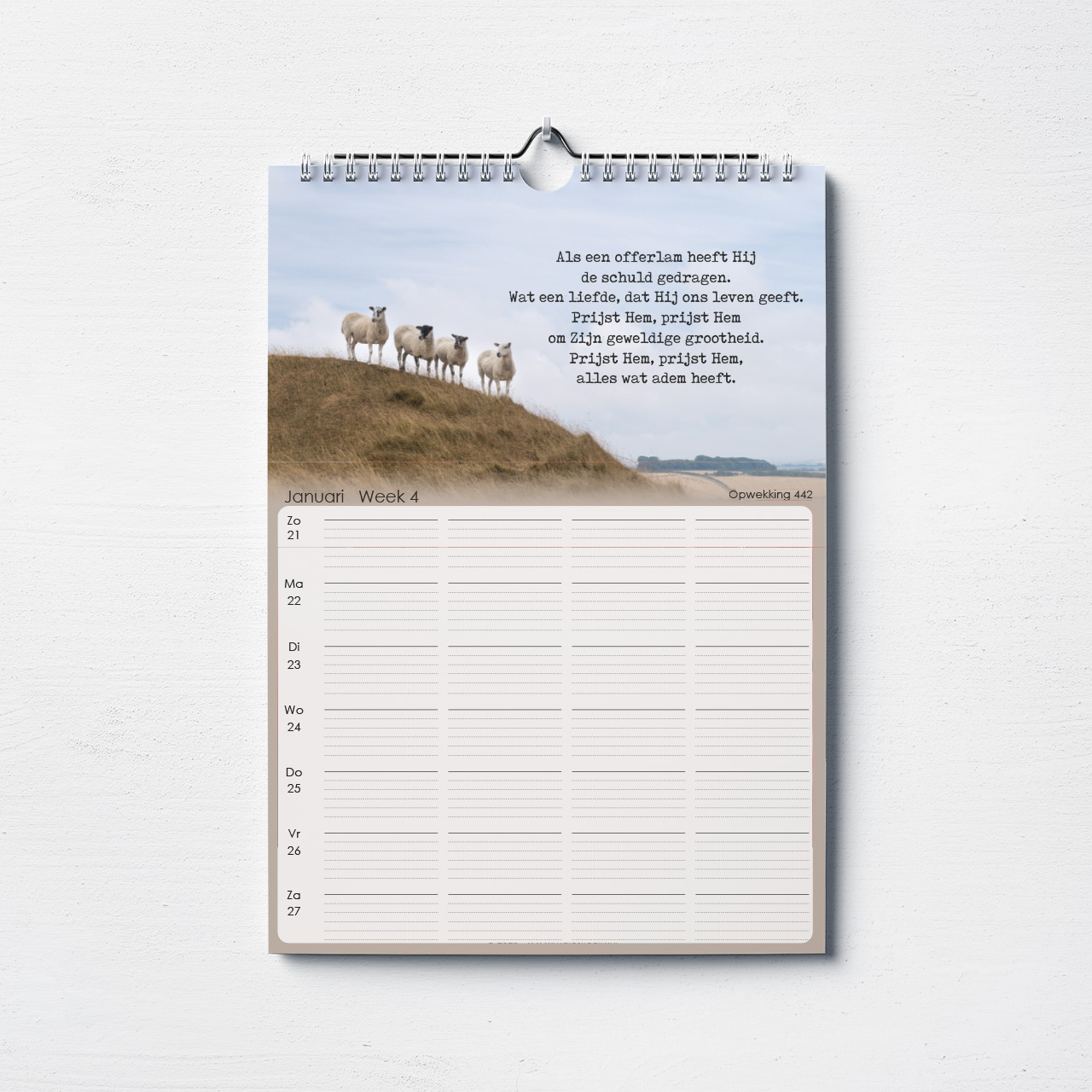 Christelijke weekplanner voor 2024 met teksten van Opwekkingsliederen, met prachtige natuurafbeeldingen. Elke week begint op zondag. De weekplanner heeft een handige ringband en veel schrijfruimte. Hierdoor is de weekplanner goed te gebruiken als familyplanner.